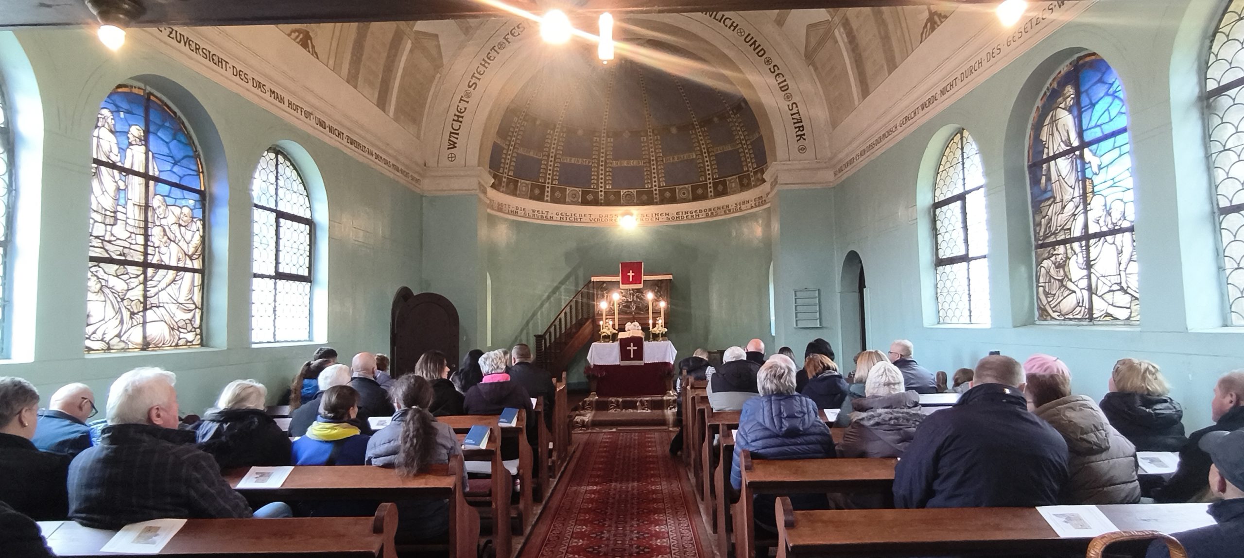 Uroczystości jubileuszowe w niewielkim kościele rozpoczęły się 26 października nabożeństwem ewangelickim, które dało wielu uczestnikom okazję do podziwiania wnętrza świątyni. Malownicza bryła budynku jest jednym z jego największych atutów, lecz także wnętrze zachwyca unikatowymi elementami architektonicznymi. Ci, którzy podczas nabożeństwa pozwalają wzrokowi wędrować po utrzymanych w odcieniach błękitu ścianach, wracają myślami do duchowej celebracji dzięki wersetom biblijnym, misternie wyrytym wokół nawy: na galerii, w łukach sklepienia nad ołtarzem i amboną oraz przy wybranych oknach. Dwa witraże po obu stronach nawy przedstawiają barwne sceny biblijne – miłosiernego Samarytanina oraz śpiących uczniów w Ogrodzie Getsemani. Niestety jeden z nich nosi ślady uszkodzeń, najprawdopodobniej po kulach.