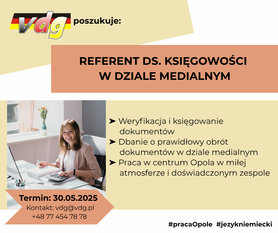 Związek Niemieckich Stowarzyszeń Społeczno-Kulturalnych w Polsce (ZNSSK) poszukuje pracownika na stanowisko: referent ds. księgowości w dziale medialnym.