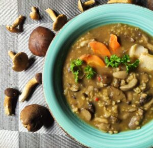I tak we wrześniu, przy okazji wyjazdów w teren, zajrzałam oczywiście do lasu, i to nie raz. Do domu po pierwszym rekonesansie w okolicy Milicza wróciłam z aromatycznymi trofeami, które posłużyły m.in. jako baza do sosu. W tym tygodniu przyszła kolej na zupę grzybową. Ugotowałam moją ulubioną, z dodatkiem kaszy. Dokładnie oczyszczone grzybki (mieszanka leśna) poddusiłam na cebulce z masłem, dodałam bulion mięsny i kaszę, a po ok. 20 minutach zupa już była gotowa.