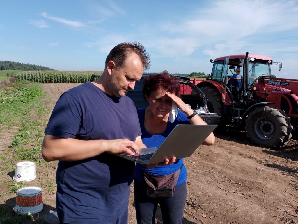 Wozu dient ein Laptop beim Kartoffelroden? Zur Ernteberechnung? Nein, um ihre Geschichte zu dokumentieren. Auf dem Foto: Sebastian Jabłoński, Koordinator der Aktion.