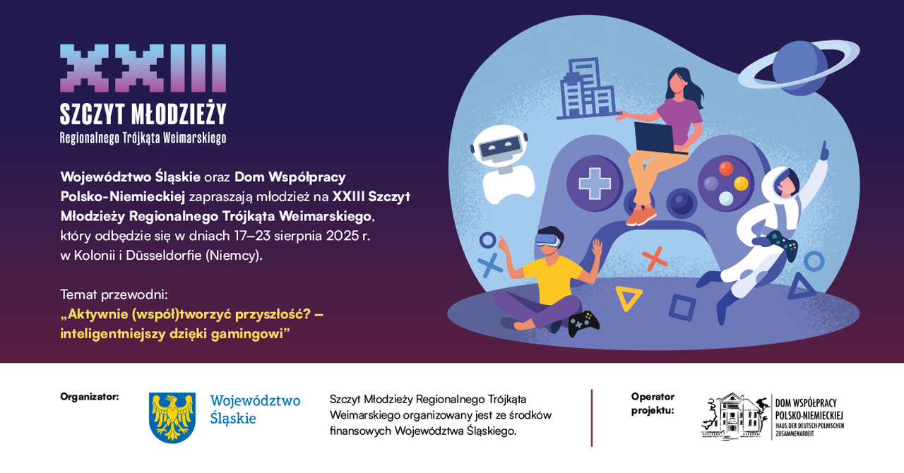 Władze województwa śląskiego i Dom Współpracy Polsko-Niemieckiej zapraszają na 23 Szczyt Młodzieży Regionalnego Trójkąta Weimarskiego. Tegoroczny szczyt młodzieży nosi tytuł „Aktywne (współ)kształtowanie przyszłości? – mądrzej dzięki grom” i ma na celu wzmocnienie umiejętności młodych ludzi, takich jak myślenie strategiczne, praca zespołowa i kreatywne rozwiązywanie problemów.