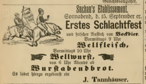 A jak to było z początkiem XX wieku? Świniobicie nie ograniczało się bynajmniej do wiejskiego stylu życia. W miastach liczne lokale wabiły gości, zapraszając na specjalne sezonowe menu prosto ze świniobicia. We wtorkowym wydaniu Kattowitzer Zeitung z 1934 r. czytamy, iż o godz. 20.15 na deskach Górnośląskiego Teatru w Bytomiu odbędzie się w akcie drugim… świniobicie, a w akcie trzecim przewidziano konsumpcję. Pozostała część mięsa zostanie podzielona na trzy części i przeznaczona na fanty w loterii. Można wygrać sute i smaczne śniadanie lub kartę podarunkową na soczystą pieczeń do odbioru w masarni, która przygotowała to teatralne świniobicie. Nie jestem pewna, czy dałabym radę przetrwać akt drugi i chętnie dowiedziałabym się opinii na temat tego osobliwego spektaklu. Ogłoszenia podobnej treści znajdziemy w dawnej prasie, gdzie restauracje, piwiarnie czy karczmy zapraszają gości do biesiadowania i próbowania specjalnych półmisków pełnych świeżych wyrobów mięsnych, kiełbas, pasztetów, smarowideł do chleba.