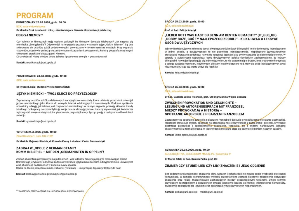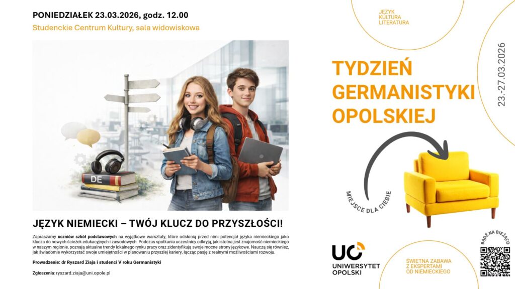 W dniach 23–27 marca 2026 roku opolska Germanistyka zaprasza na Tydzień Germanistyki Opolskiej – cykl wydarzeń poświęconych językowi, literaturze i kulturze krajów niemieckojęzycznych. Program obejmuje warsztaty edukacyjne, wykłady, spotkania autorskie oraz wydarzenia o charakterze interaktywnym, przygotowane przez pracowników naukowych oraz studentów kierunków „Germanistyka i Język niemiecki w biznesie i komunikacji publicznej” Uniwersytetu Opolskiego.