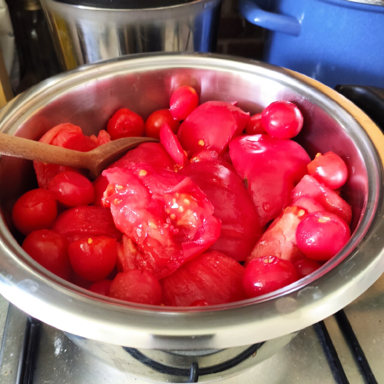 W naszej kuchni wiele rzeczy dzieje się równolegle. Świeżo zebrane pomidory różnych odmian przerabialiśmy na zimowe przetwory. Nie wszystko trafiło do spiżarni – próbowaliśmy smaków lata na bieżąco (w tym roku lato jest wyjątkowo kapryśne). Z przecieru pomidorowego ugotowałam gęstą, kolorową zupę pomidorową według takiego przepisu: