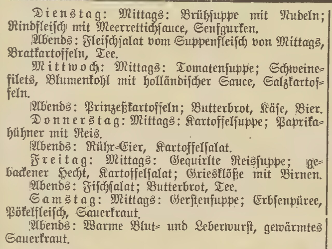 Tygodnik „Haus, Hof, Garten” publikuje menu obiadowe, w którym zupa pomidorowa robiona jest na zasmażce: z 1 łyżki masła i 1 łyżki mąki, do której wlewa się bulion i dodaje ½ kg drobno pokrojonych pomidorów. Całość przeciera się przez gęste sito i podaje w formie zawiesistej zupy.