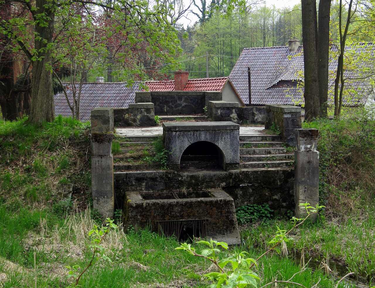 Stawy zamknięto monumentalnymi kamiennymi tamami z wysokimi pylonami, po których spływała woda kaskadami. Obok wzniesiono mostki, ławeczki i małe tarasy, które pozwalały na spokojny wypoczynek nad wodą. Cały teren otaczało stylowe ogrodzenie z dwoma bramami – górną kamienną i dolną drewniano-metalową. W bramach wkomponowano fragmenty XVI-wiecznej kamieniarki – piaskowcowe płaskorzeźby personifikujące cnoty Wiary i Miłosierdzia oraz akantowe ornamenty, pochodzące z renesansowego nagrobka książąt von Schönaich-Carolath ze Słupic. To połączenie lokalnej historii z artystycznym kunsztem czyniło park niezwykle oryginalnym.