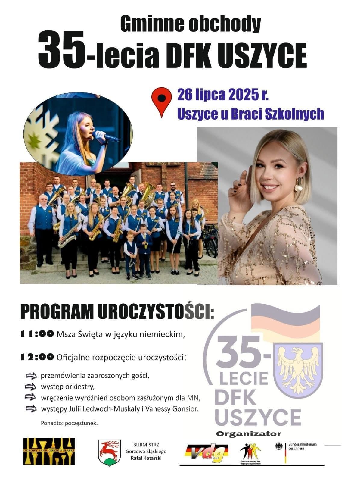Już w sobotę, 26 lipca 2025 roku, w Uszycach u Braci Szkolnych odbędą się gminne obchody 35-lecia istnienia DFK Uszyce. Będzie to wyjątkowe wydarzenie, które zgromadzi mieszkańców oraz zaproszonych gości, by wspólnie uczcić ten piękny jubileusz. Uroczystości rozpoczną się o godz. 11:00 Mszą Świętą w języku niemieckim, a o godz. 12:00 nastąpi oficjalne otwarcie wydarzenia. W programie przewidziane są przemówienia zaproszonych gości, występ orkiestry, wręczenie wyróżnień osobom zasłużonym dla Mniejszości Niemieckiej, a także występy artystyczne Julii Ledwoch-Muskały oraz Vanessy Gonsior. Nie zabraknie też poczęstunku i serdecznej atmosfery, z której słyną wydarzenia organizowane przez DFK. Organizatorzy zapraszają wszystkich mieszkańców do wspólnego świętowania tego ważnego jubileuszu.
