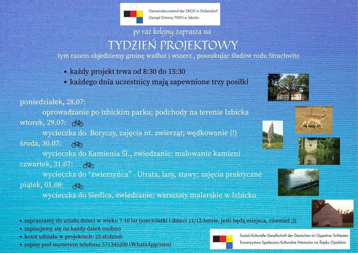 W dniach od 28 lipca do 1 sierpnia Zarząd Gminny TSKN w Izbicku organizuje kolejną edycję Tygodnia Projektowego dla dzieci w wieku 7–10 lat. Tegoroczne zajęcia odbędą się pod hasłem odkrywania historii rodu Strachwitz oraz poznawania uroków gminy Izbicko i jej okolic. Każdego dnia na uczestników czekać będą różnorodne atrakcje – od zabaw terenowych i spacerów z przewodnikiem po izbickim parku, przez wycieczki rowerowe (do Boryczy, Kamienia Śl. i Siedlca), po ciekawe warsztaty, takie jak malowanie kamieni, zajęcia przyrodnicze i plastyczne. Dużym zainteresowaniem z pewnością cieszyć się będą także spotkania ze zwierzętami oraz możliwość spróbowania swoich sił w wędkowaniu. Organizatorzy zapewnią dzieciom trzy posiłki dziennie oraz opiekę w godzinach 8:30–15:30. Tydzień Projektowy będzie doskonałą okazją do nauki, zabawy i rozwijania pasji, a także do integracji młodych mieszkańców gminy.