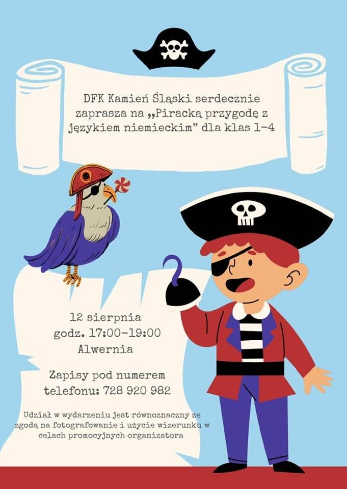 DFK Kamień Śląski organizuje dla uczniów klas 1–4 wyjątkowe wydarzenie pod nazwą „Piracka przygoda z językiem niemieckim”. Spotkanie odbędzie się 12 sierpnia roku, w godzinach 17:00–19:00, w Alwerni. W ramach zajęć dzieci wezmą udział w kreatywnych zabawach i animacjach, których celem będzie nie tylko świetna zabawa, ale także kontakt z językiem niemieckim w przystępnej, pirackiej formie. Organizatorzy zapewniają mnóstwo radości i edukacji w przyjaznej atmosferze. Zapisy prowadzone są telefonicznie pod numerem 728 920 982. Udział w wydarzeniu będzie równoznaczny ze zgodą na fotografowanie i wykorzystanie wizerunku uczestników do celów promocyjnych organizatora.