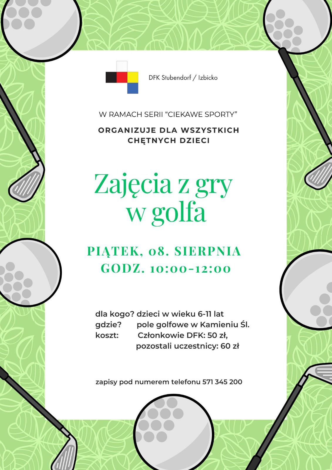 DFK Izbicko organizuje zajęcia z gry w golfa dla dzieci w wieku od 6 do 11 lat. Wydarzenie odbędzie się w piątek, 8 sierpnia 2025 roku, w godzinach 10:00–12:00, w ramach serii spotkań pod hasłem „Ciekawe sporty”. Zajęcia zostaną przeprowadzone na polu golfowym w Kamieniu Śląskim i będą doskonałą okazją, by dzieci mogły poznać podstawy gry w golfa oraz aktywnie spędzić czas na świeżym powietrzu. Koszt udziału wyniesie 50 zł dla członków DFK oraz 60 zł dla pozostałych uczestników. Zapisy będą prowadzone telefonicznie pod numerem 571 345 200.