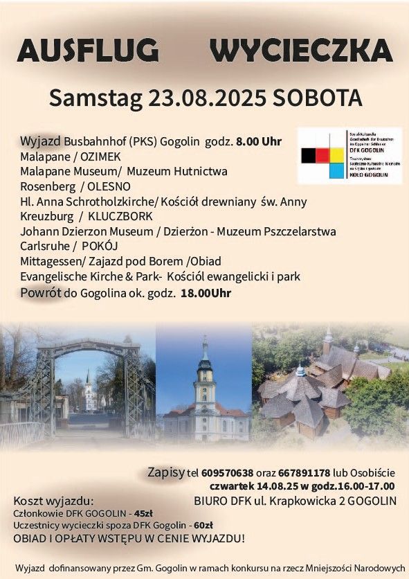 DFK Gogolin organizuje wycieczkę krajoznawczą, która odbędzie się w sobotę, 23 sierpnia 2025 roku. Wyjazd zaplanowano o godzinie 8:00 z dworca PKS w Gogolinie. Uczestnicy odwiedzą m.in. Ozimek, gdzie zwiedzą Muzeum Hutnictwa, następnie Olesno oraz Kluczbork z drewnianym kościołem św. Anny. W programie przewidziano także wizytę w Muzeum Pszczelarstwa im. Johanna Dzierzona oraz w miejscowości Pokój, gdzie będzie można podziwiać kościół ewangelicki wraz z otaczającym go parkiem. W trakcie wycieczki zaplanowany jest również obiad w Zajeździe „Pod Borem”. Powrót do Gogolina przewidziano około godziny 18:00. Koszt udziału wynosi 45 zł dla członków DFK Gogolin oraz 60 zł dla pozostałych uczestników. Cena obejmuje przejazd, obiad oraz bilety wstępu.