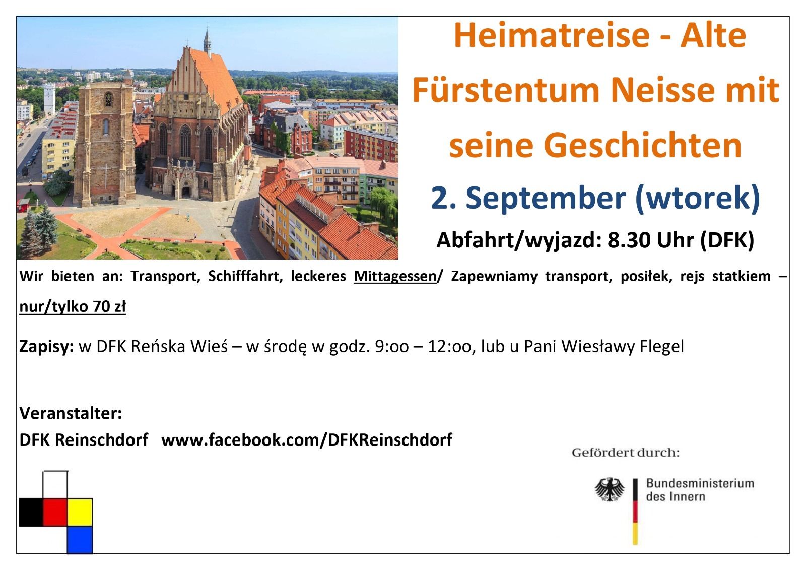 DFK Reńska Wieś zaprasza na wyjątkową „Podróż do małej ojczyzny – Stare Księstwo Nyskie i jego historie”, która odbędzie się we wtorek, 2 września 2025 roku. Wyjazd rozpocznie się o godzinie 8:30 spod siedziby DFK. Uczestnicy będą mieli okazję poznać fascynujące dzieje regionu, skorzystać z rejsu statkiem oraz wspólnie zjeść smaczny obiad.Koszt udziału to jedynie 70 zł. Cena obejmuje transport, rejs statkiem oraz posiłek. Zapisy przyjmowane są w biurze DFK Reńska Wieś w każdą środę w godz. 9:00–12:00, a także u Pani Wiesławy Flegel. Organizatorem wydarzenia jest DFK Reńska Wieś.