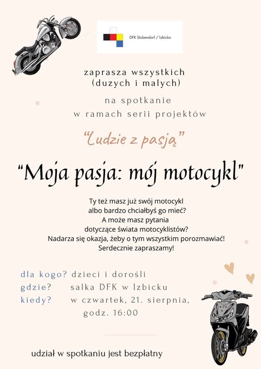 DFK Izbicko zaprasza wszystkich – zarówno dużych, jak i małych – na kolejne spotkanie w ramach serii projektów „Ludzie z pasją”. Tym razem tematem będzie „Moja pasja: mój motocykl”. Spotkanie odbędzie się w czwartek, 21 sierpnia o godzinie 16:00 w salce DFK w Izbicku. To doskonała okazja, aby porozmawiać o świecie motocyklistów – zarówno dla tych, którzy już mają swój motocykl, jak i dla tych, którzy dopiero marzą o jego posiadaniu lub mają pytania dotyczące tej pasji. Udział w spotkaniu jest bezpłatny. DFK zaprasza mieszkańców Izbicka i okolic do wspólnego dzielenia się doświadczeniami i pasją motocyklową.