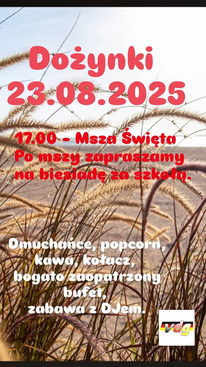 DFK Wróblin zaprasza na dożynki, które odbędą się 23 sierpnia 2025 roku. Uroczystość rozpocznie się o godzinie 17:00 Mszą Świętą. Po mszy zapraszamy na biesiadę za szkołą, gdzie uczestników czekać będą dmuchańce, popcorn, kawa, kołacz oraz bogato zaopatrzony bufet. Wieczorem odbędzie się zabawa taneczna z DJ-em.