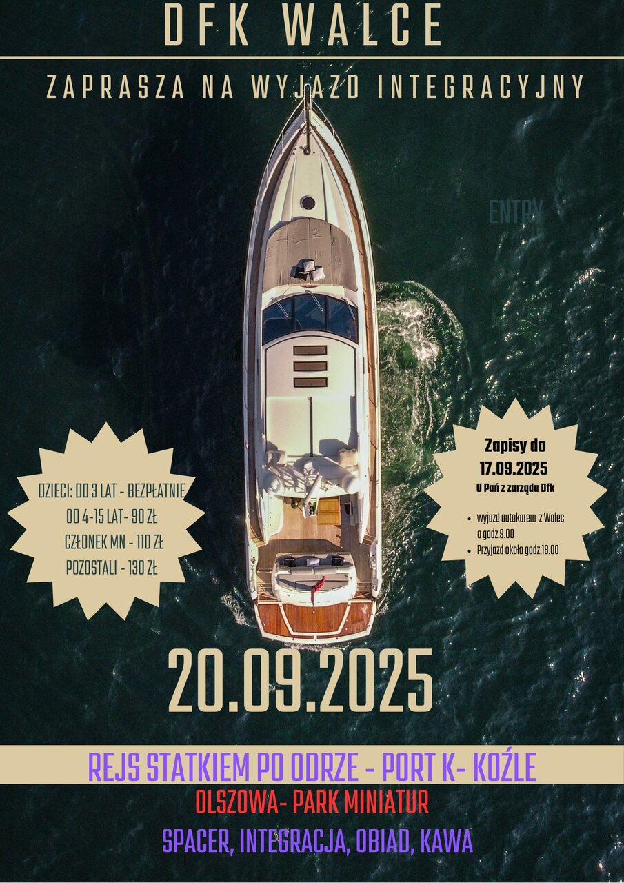 DFK Walce zaprasza członków i sympatyków na integracyjną wycieczkę autokarową, która odbędzie się w sobotę, 20 września 2025 roku. Wyjazd zaplanowano na godzinę 9.00, a zapisy przyjmowane są do 17 września. W programie przewidziano szereg atrakcji: rejs statkiem po Odrze z portu w Kędzierzynie-Koźlu, wizytę w parku miniatur w Olszowej, wspólny obiad oraz spacer. Koszt udziału wynosi:
