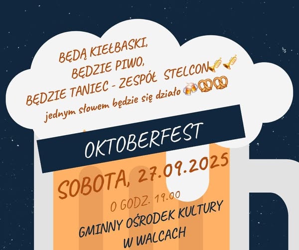 W sobotę, 27 września 2025 roku, w Gminnym Ośrodku Kultury w Walcach odbędzie się Oktoberfest. Początek wydarzenia zaplanowano na godzinę 19.00. Uczestnicy będą mogli spróbować bawarskich przysmaków, takich jak kiełbaski i piwo serwowane prosto z beczek. Do tańca zagra zespół Stelcon. Zaprasza organizator: DFK Walce.