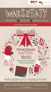 DFK Wróblin zaprasza 24 listopada 2025 o godz. 18:00 do sali gminnej w Wróblinie na kreatywne warsztaty świąteczne. Pod kierunkiem florystki Darii Malorny uczestnicy będą tworzyć własne wieńce bożonarodzeniowe i dekoracje adwentowe. Zapisy przyjmuje Maria Maloszek (telefon: 697 609 173). Organizatorzy serdecznie zapraszają wszystkich chętnych do wspólnego rozpoczęcia okresu przedświątecznego w przyjaznej atmosferze.