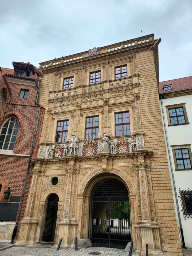 Jednym z najważniejszych elementów odbudowanego Zamku Piastowskiego jest bogato zdobiony budynek bramny z żółtego piaskowca. Trzykondygnacyjny portal uważany jest za jeden z najpiękniejszych renesansowych portali na Śląsku. Nad głównym wejściem wyrzeźbiono w kamieniu księcia Jerzego II i jego żonę Barbarę Brandenburską – manifest książęcej reprezentacji i sojuszów dynastycznych.